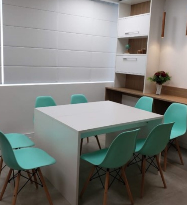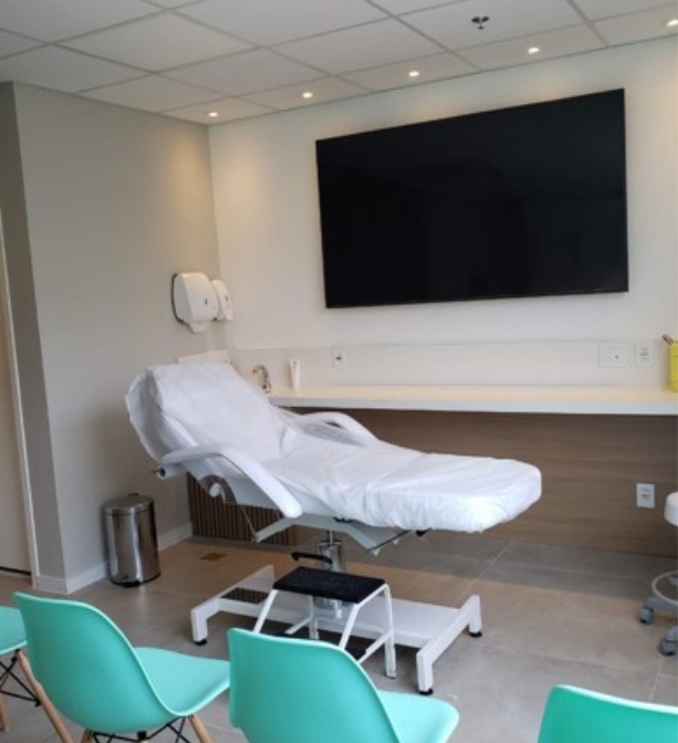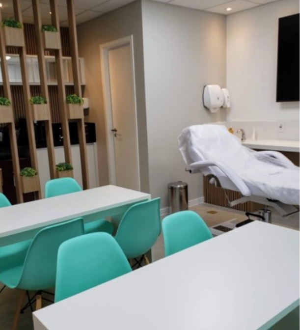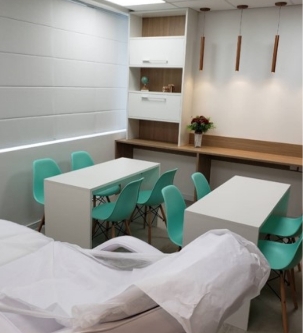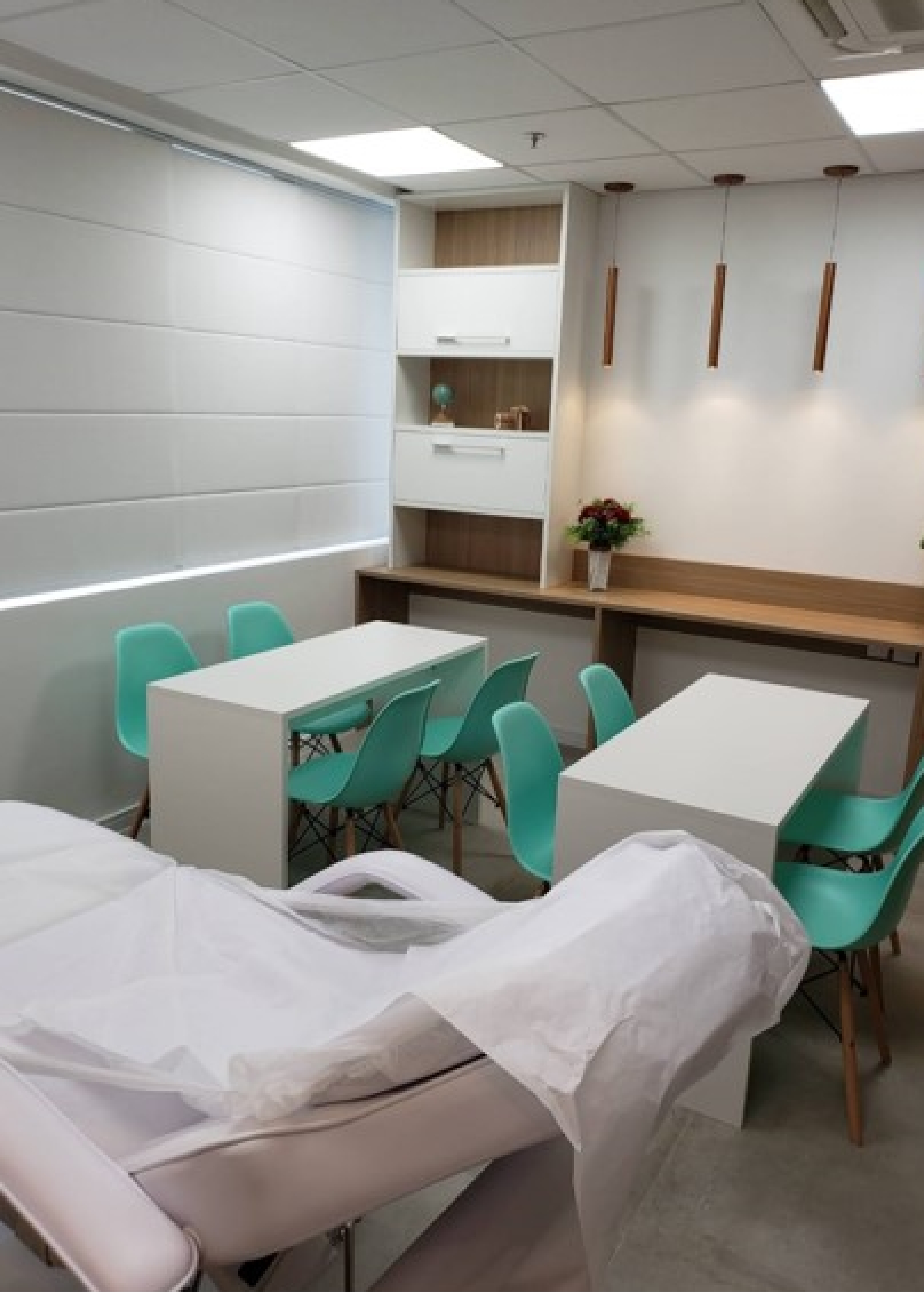 A estrutura é desenhada especificamente para atender a essa finalidade, contando com um ambiente climatizado e bem decorado,  grande o suficiente para comportar 6 médicos, confortavelmente, para as aulas teóricas e práticas, com uma TV de 75 polegadas, maca regulável e mesas acessórias, além de um espaço para coffee delicioso!